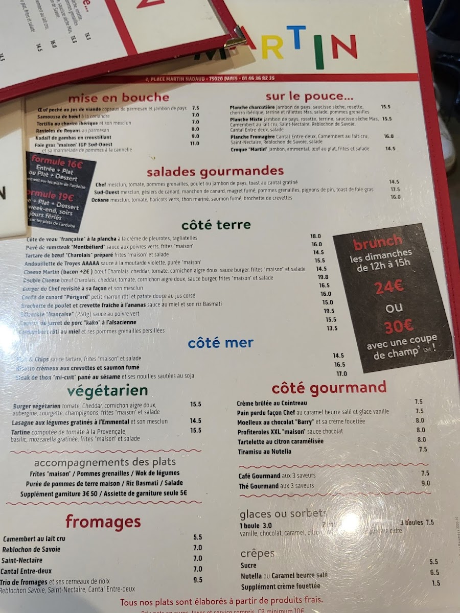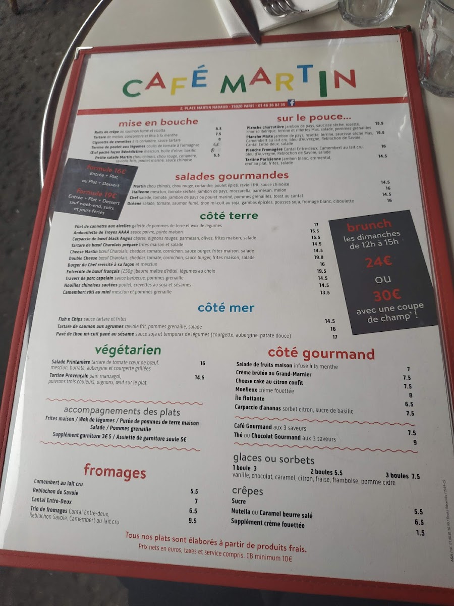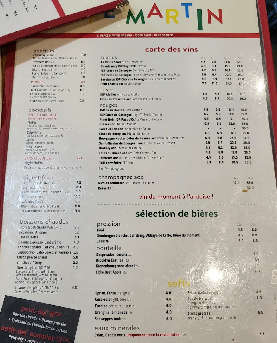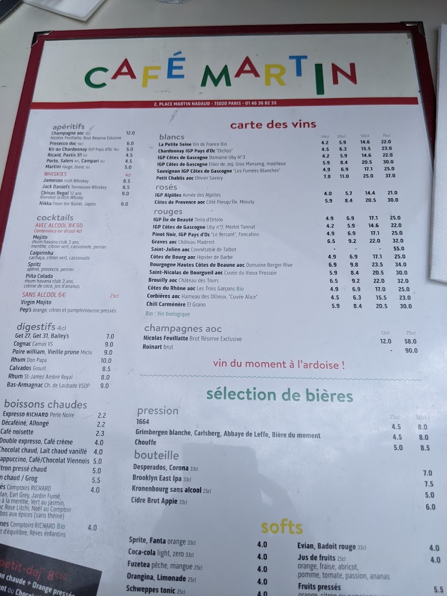 Café Martin, nestled in the vibrant 20th arrondissement of Paris, is a charming French bistro that balances tradition with fresh, bold flavors. The menu is a harmonious blend of classic and inventive dishes, showcasing their culinary craft. Highlights include the Supréme De Volaille, Jus De Viande Corsé, paired perfectly with crispy potato galettes, and the Steack D'espadon À La Plancha with a unique Thai-style Chinese cabbage—each plate boasting rich textures and balanced seasoning.